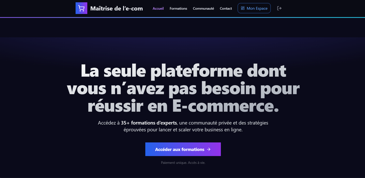 Il s'agit d'un programme de formation en e-commerce et de l'accès à la plateforme qui centralise tout ce dont tu as besoin. Tout est conçu pour les débutants (sans aucune expérience) pour apprendre à construire un commerce en ligne.