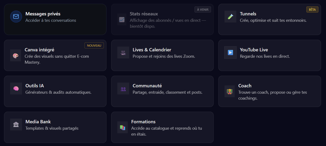 Grâce à sa plateforme et à son pack formation, E-com Mastery te donne tous les outils, les stratègies, le savoir, et une communauté qui avance dans le même sens que toi.